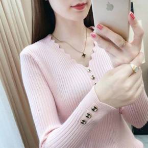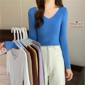 外贸女装V领针织衫2022春秋冬打底衫女修身纯色毛...