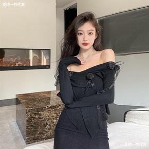 泡泡袖毛衣女秋冬韩版修身显瘦型领露锁骨长袖打底针织...