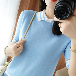 小宜D制【小polo条纹针织衫】毛衣打底衫设计感女...