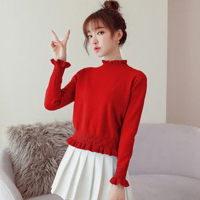 秋冬短款小个子毛衣女长袖加厚打底衫荷叶边收腰上衣粗...