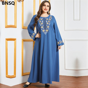 2065 都市休闲长裙蓝色大版宽松腰长袖刺绣大码女...