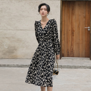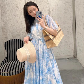 D家22新款荷叶边袖子真丝印花大摆连衣裙收腰优雅度...