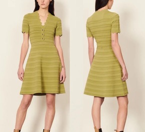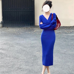 酒午自制法式复古春季V领包臀打底过膝中长款毛衣裙针...