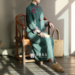 8818喜墨复古加绒加厚连衣裙长袖宽松民族风新款女...