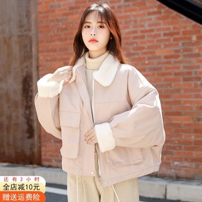 2021秋冬新款牛仔棉服女短款韩版兔毛领加绒加厚宽...