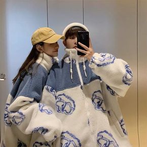 冬季羊羔毛外套女宽松撞色卡通棉服韩版潮流休闲立领加...