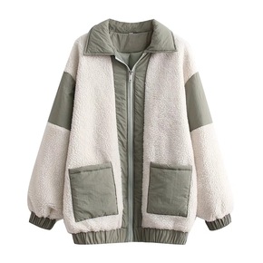 欧美时尚拼色羊羔毛棉服女宽松显瘦翻领口袋装饰短款开...