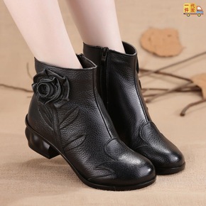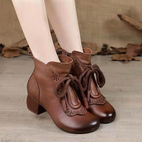 春秋季民族风女靴皮靴子中跟粗跟圆头短筒棉靴手工单靴...