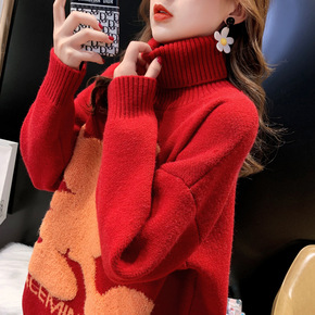 高领加厚红色圣诞毛衣女套头加厚慵懒风宽松外穿打底衫...