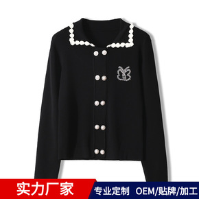 2022春装新手勾边长袖翻领纯色蝴蝶钉珠珍珠纽扣针...