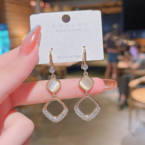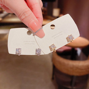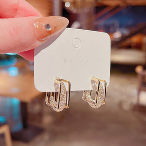 S925银针个性简约镂空水晶方形耳圈女网红气质时尚...