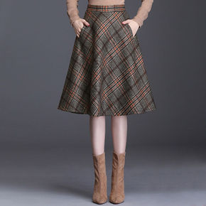 时尚格纹秋冬毛呢半身裙中长款女新款高腰大摆松紧A字...