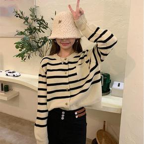 秋冬韩版短款针织开衫外套新款软糯厚实坑条纹单排扣外...