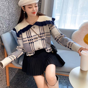 拼色格子毛衣女韩宽松日系套头穿搭慵懒风外穿针织衫秋...