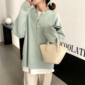 温柔豆绿色毛衣女宽松外穿韩版简约纽扣圆领毛线衣中长...
