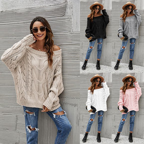 2022秋冬跨境欧美露肩大码宽松针织衫亚马逊一字领...