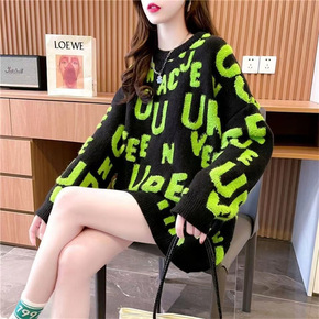 字母针织毛衣女休闲秋冬新款套头拼接韩版加厚圆领宽松...