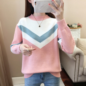 2022年秋冬季加厚圆领针织毛衣女宽松拼色新款打底...