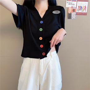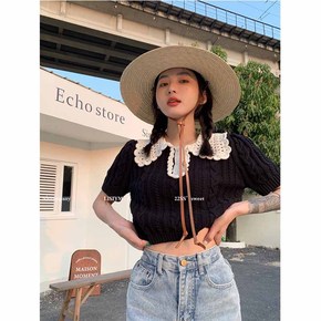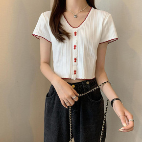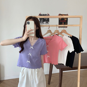 夏季新品法式韩版v领木耳边短款甜美小众V领短袖针织...