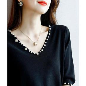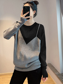 黑色假两件针织衫女设计感圆领气质打底毛衣冬季新款2...