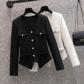 2022春季新款小众不规则紧身长袖开衫上衣方领针织...