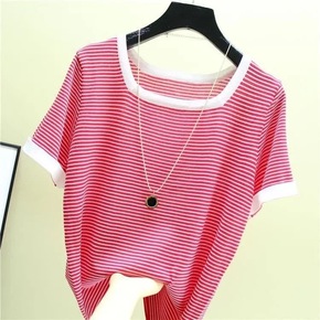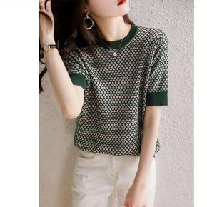 撞色格纹圆领短袖t恤女2022夏季新款冰丝针织衫宽...