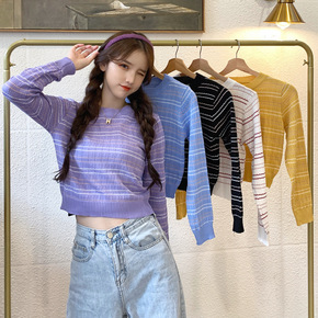 针织衫秋季新款女短款毛衣配裙子套头薄款长袖高腰上衣...