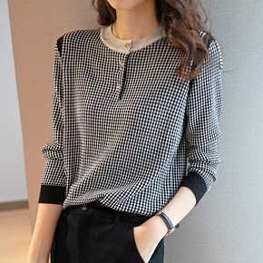 2022新款春秋千鸟格针织衫女长袖法式简约撞色内搭...
