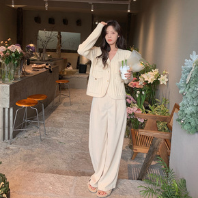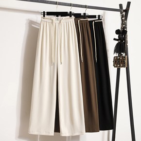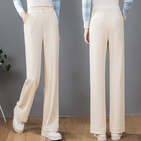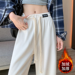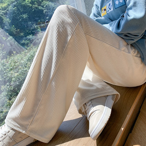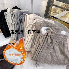 宽松高腰加绒加厚针织坑条绒阔腿裤女秋冬垂感拖地直筒...