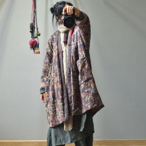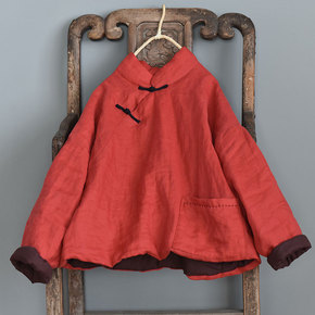 2020秋冬新款宽松复古立领盘扣亚麻中长款夹棉女式...