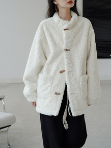 白色羊羔毛绒外套女秋冬韩版牛角扣设计感保暖宽松小个...