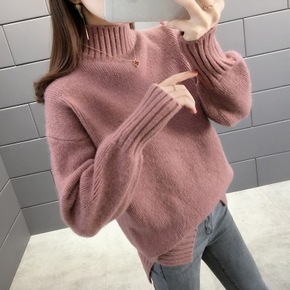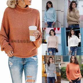 秋冬亚马逊爆款针织衫宽松纯色大码气质通勤高领毛衣女...