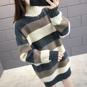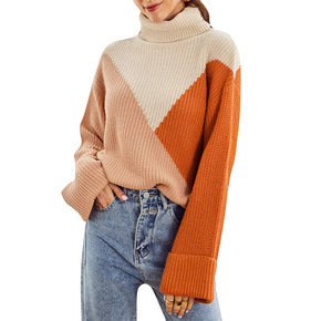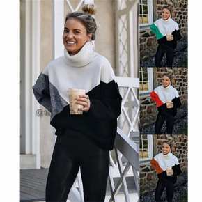 欧货撞色拼接高领套头加厚保暖毛衣女2021冬季新款...