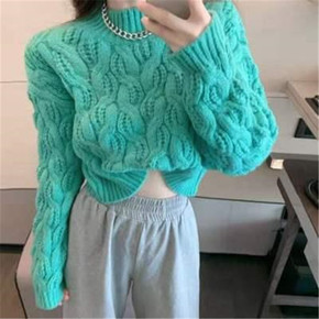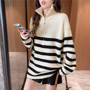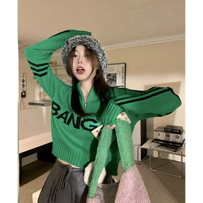 半高领拉链毛衣女字母绿色条纹长袖针织衫冬季短款小个...