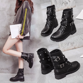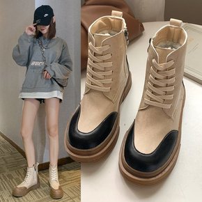 英伦皮面马丁靴秋冬新款女单靴手工时尚拼色系带短筒棉...