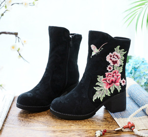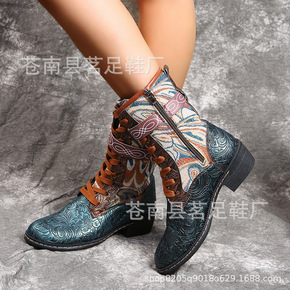 现货2021外贸新款欧美绣花马丁靴女刺绣民族风方跟...