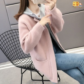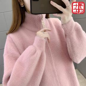 包邮仿水貂绒连帽针织拉链开衫女秋冬季新款时尚洋气毛...