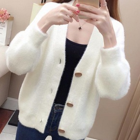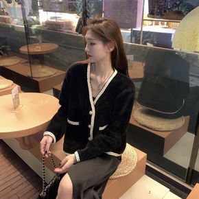 2022春秋新款韩版仿水貂绒针织开衫外套毛衣女短款...