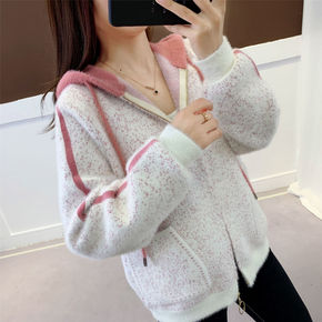 水貂绒外套女春秋装2022年新款拉链连帽毛衣针织衫...