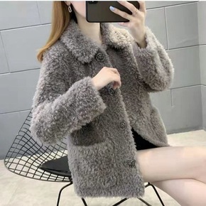 欧美米色羊羔毛皮草秋冬季高腰外套女150小个子短款...
