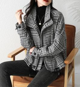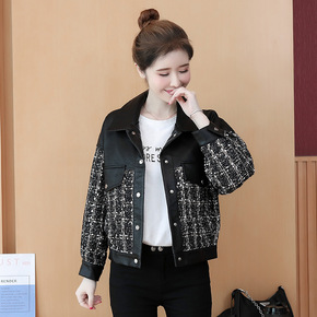 复古格纹廓形羊皮拼接短款外套女2021早秋新款百搭...
