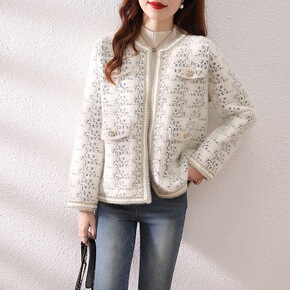 外套女春秋水貂绒毛衣年早春新款白色小香风开衫秋冬春...