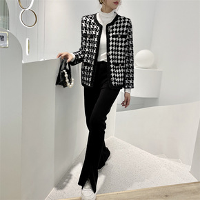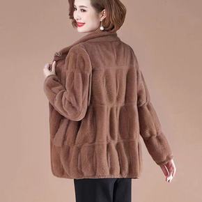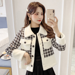 女士秋冬短款仿水貂绒单排扣宽松针织格子外套气质通勤...