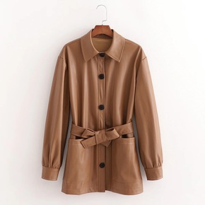 pu仿皮衬衫外套欧美长袖宽松型棕色仿皮革单排扣翻领...