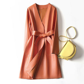 2021春季时尚款气质韩版女式真皮皮衣中长款腰带翻...