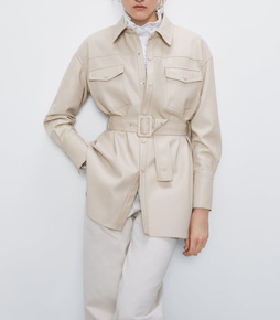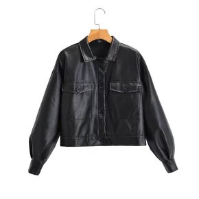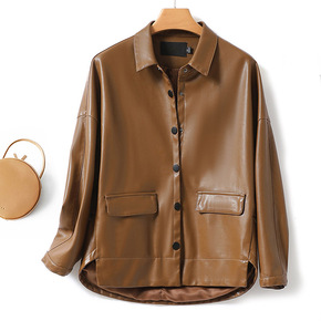 欧美风秋冬季街头气质PU皮开衫长袖翻领直筒型女式衬...