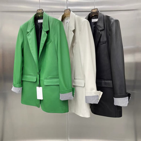 跨境中长修身单排扣风衣纯色PU机车皮衣西装外套上衣...