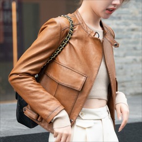 海宁短款机车真皮皮衣女进口绵羊皮2022早春新款简...