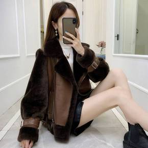 皮衣女秋冬复古港风宽松毛绒皮机车服加绒加厚皮衣夹克...