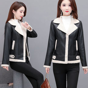 皮毛一体女黑哥 韩版宽松羊羔毛外套女 加厚机车皮衣...